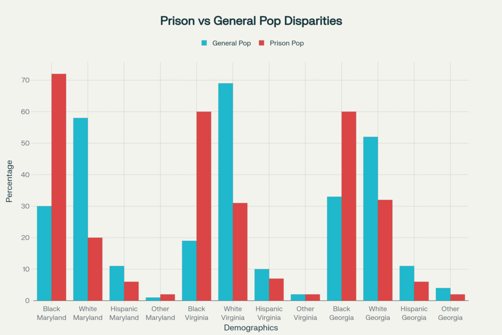 Comparison of racial composition between general population and prison populations in Maryland, Virginia, and Georgia, showing significant overrepresentation of Black Americans in all three state prison systems