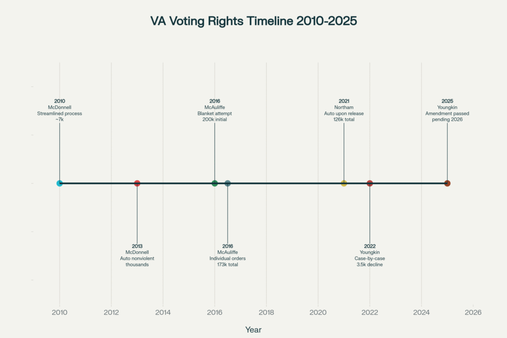 Timeline of Virginia’s voting rights restoration policies from 2010-2025, showing the evolution from restrictive to automatic restoration and back to individual review under different governors