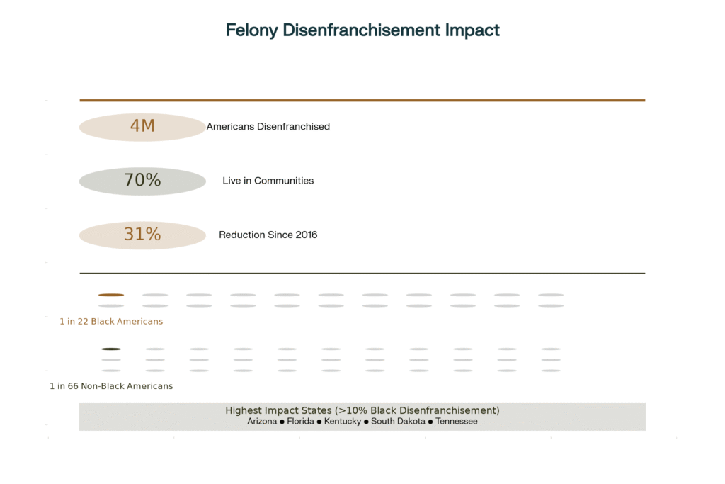 Today, this Jim Crow-era strategy affects 4 million Americans, with Black citizens representing 2.2 million of the disenfranchised despite comprising less than 15% of the population (Center for Public Integrity). The racial impact varies dramatically by state, with Tennessee, Florida, Kentucky, South Dakota, and Arizona disenfranchising over 10% of their Black voting-age populations (Legal News).